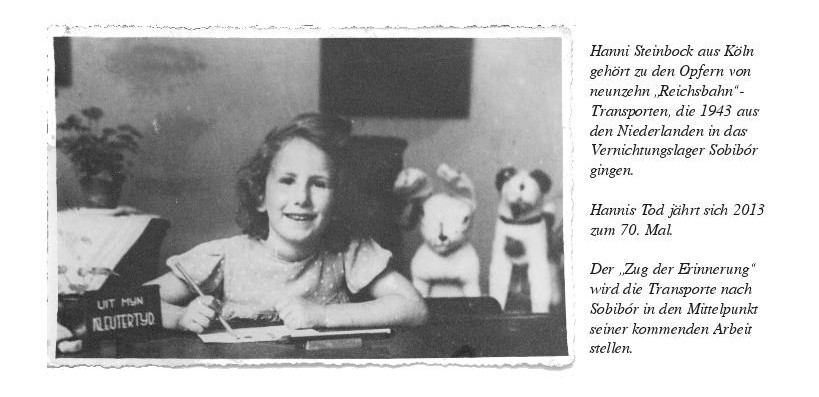 70 Jahre nach den Verbrechen an tausenden Kindern im NS-Vernichtungslager Sobibór, von Mai bis Juni 2013, will der "Zug der Erinnerung" die Ermordeten ehren und in ihre deutschen Heimatregionen fahren (In Aussicht genommene Haltepunkte u.a.: Leer, Oldenburg, Dortmund, Bielefeld, Hannover, Braunschweig, Magdeburg, Rathenow/Brandenburg, Potsdam, Berlin und Frankfurt/Oder).