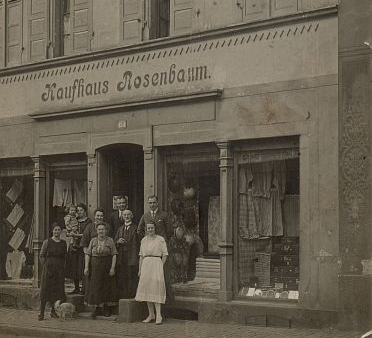 In Germersheim begann die Aussonderung jüdischer Schüler 1935. Die Bezirksschulbehörde ordnete am 24. September an, sämtliche Kinder "nichtarischer Abstammung" zu melden. An dieser diskriminierenden "Erfassung" beteiligte sich das Lehrpersonal. Der "Nachweis der Rassezugehörigkeit" ergab, daß aus Hagenbach 1 Hauptschüler "Volljude" war. In Kandel und Leimersheim wurde ebenfalls 1 Schüler als "Volljude" bezeichnet. In Rülzheim traf diese demütigende Bezeichnung auf 12 Hauptschüler zu. Ihre Familien gehörten zur Ortsbevölkerung und gingen bürgerlichen Berufen nach (Foto: Familie Rosenbaum vor ihrem kleinen Kaufhaus in Germersheim).