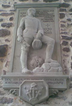 An der Außenfassade des Eisenacher Martin-Luther-Gymnasiums wird auf einer Steinplastik an die toten Schüler der Jahre 1939 bis 1945 erinnert. Gemeint sind die gefallenen Jugendlichen, die für die Verteidigung des NS-Regimes starben. Ihnen gebühre ein "Lorbeer", heißt es "in heisser Dankbarkeit". Daß diese Jugendlichen auch Auschwitz verteidigten, wußten sie wahrscheinlich nicht.