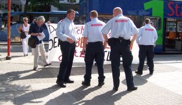 Mit Hausverboten und dem Einsatz von Sicherheitskräften versucht die DB AG einer öffentlichen Ehrung der "Reichsbahn"-Opfer zu entgehen. Auf dem "Bahnhofsfest" in Hamburg kam es deswegen am 11. Juli zu Zusammenstößen mit Demonstranten, die Informationsmaterial verteilen wollten (Pressemitteilung). Für das Gedenken an die über 6.000 Deportierten, die auf dem Hamburger Schienennetz nach Minsk, Theresienstadt oder Auschwitz verschleppt wurden, biete das Eisenbahnjubiläum "nicht den geeigneten Rahmen", beschied das Bahnhofsmanagement die Demonstranten und wies sie aus dem DB-Gelände. Angesichts der erwarteten Demonstrationen auf anderen DB-Festen, deren Höhepunkt ein Auftritt der Bundeskanzlerin ist, sind weitere Auseinandersetzungen vorhersehbar.
