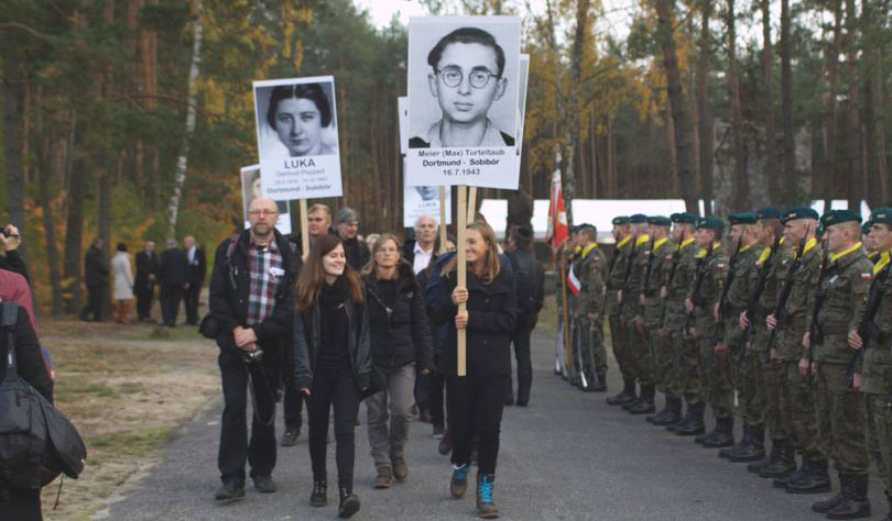 Am 14. Oktober 2013 auf dem Weg zum Aschefeld, in dem die Überreste von wahrscheinlich 250.000 Ermordeten aus ganz Europa liegen. Die quantitativ größte Opfergruppe war in Polen zu Hause. Genau 70 Jahre nach dem Sobibór-Aufstand erwies der polnische Staat den Ermordeten militärischen Ehren.